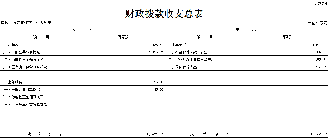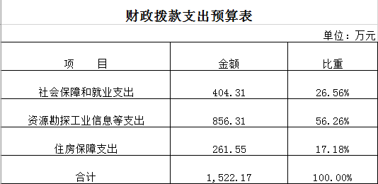 2023年财政拨款收支总预算1522.17万元。收入包括:一般公共预算拨款1426.67万元、上年结转95.5万元;支出包括:社会保障和就业支出404.31万元、资源勘探工业信息等支出856.31万元、住房保障支出261.55万元。