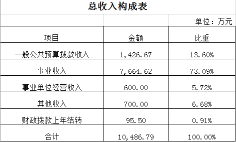 2023年收入预算10486.79万元,其中上年结转95.5万元,占0.91%;一般公共预算拨款收入1426.67万元,占13.6%;事业收入7664.62万元,占73.09%;事业单位经营收入600万元,占5.72%;其他收入700万元,占6.68%。