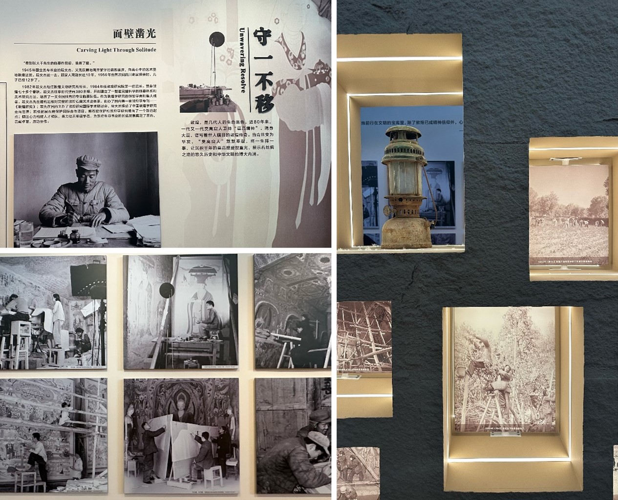 步入展厅,珍贵的历史文献、老照片及视频影像映入眼帘。常书鸿先生在艰苦环境下使用的简陋工具,段文杰先生密密麻麻的研究手稿,都诉说着他们为敦煌事业的无私付出。在极端恶劣的自然条件下,他们克服物资匮乏、交通不便等重重困难,以坚定的信念和顽强的毅力,让莫高窟在新时代焕发新生机。这些都诠释着“坚守大漠、甘于奉献、勇于担当、开拓进取”的“莫高精神”。