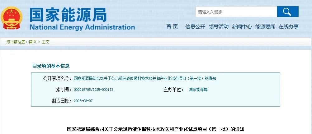 8月7日,国家能源局发布《关于公示绿色液体燃料技术攻关和产业化试点项目(第一批)的通知》,拟支持9个项目开展绿色液体燃料技术攻关和产业化试点工作,公示时间为2025年8月7日至8月13日。