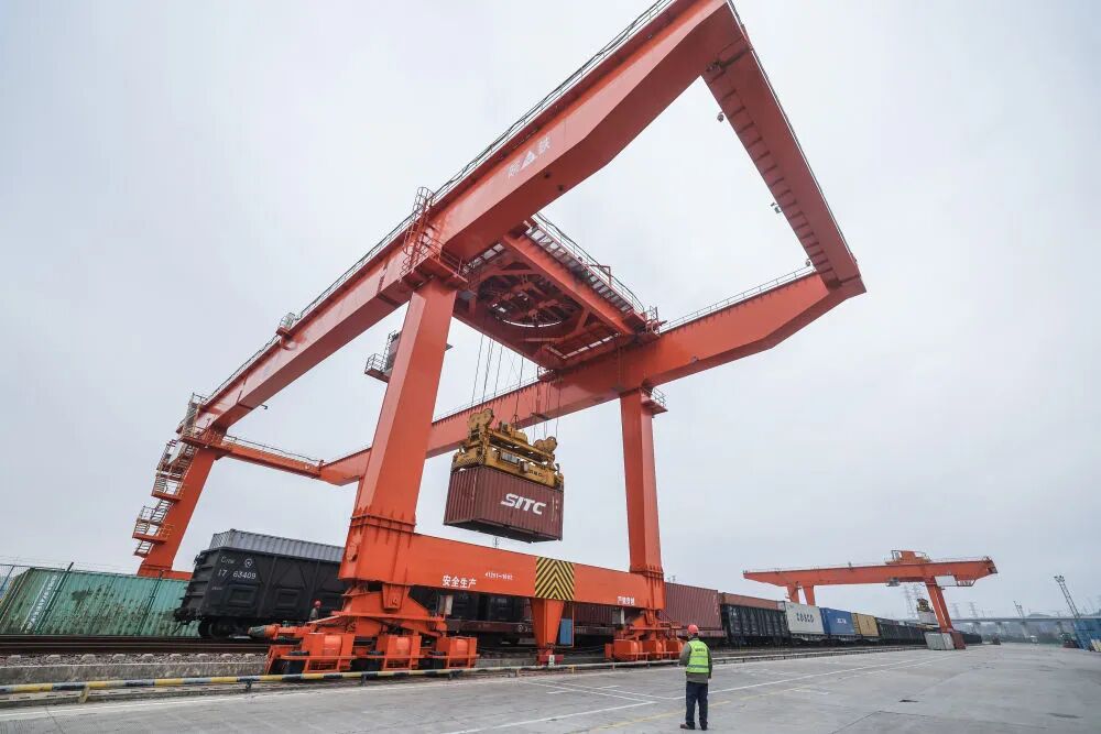 2026年1月30日,在浙江义乌铁路口岸,一列载着红酒、葵花籽油、气泡水等进口商品的中欧班列回程班列在卸货。新华社记者 徐昱 摄