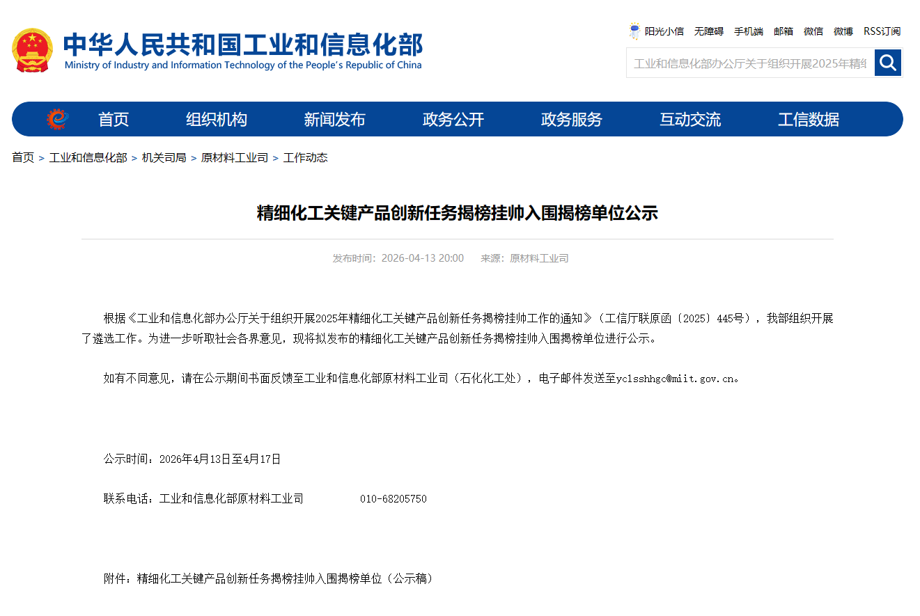 工信部发布《精细化工关键产品创新任务揭榜挂帅入围揭榜单位》